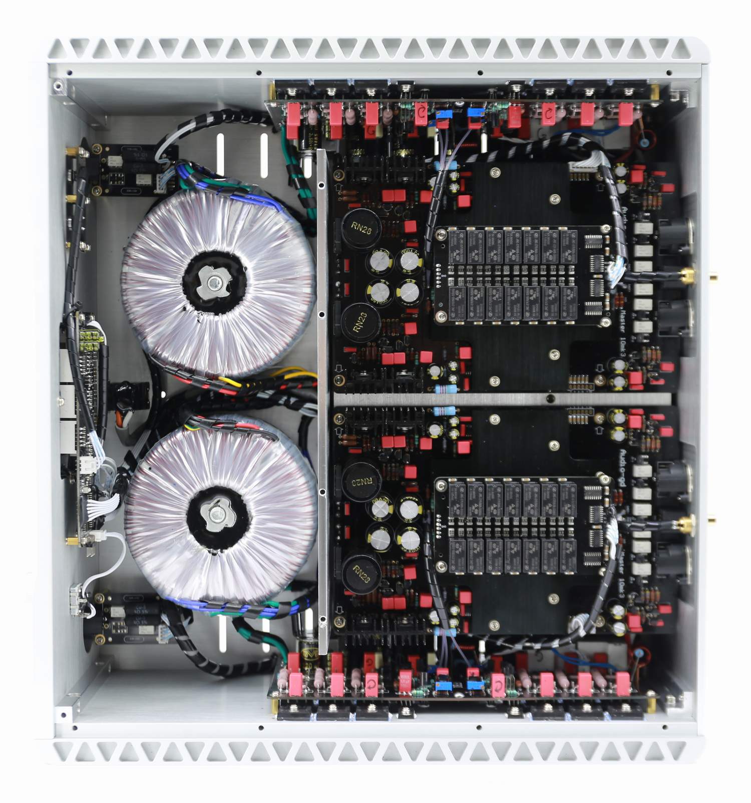 Master-10 MK3 otrzymał obudowę z litego aluminium o wysokiej masie, co gwarantuje skuteczne tłumienie drgań i ekranowanie przed zakłóceniami elektromagnetycznymi. Wnętrze zostało podzielone aluminiowymi przegrodami na niezależne sekcje zasilania, przetwarzania sygnału oraz wyjścia, co zapewnia maksymalną izolację i czystość sygnału.