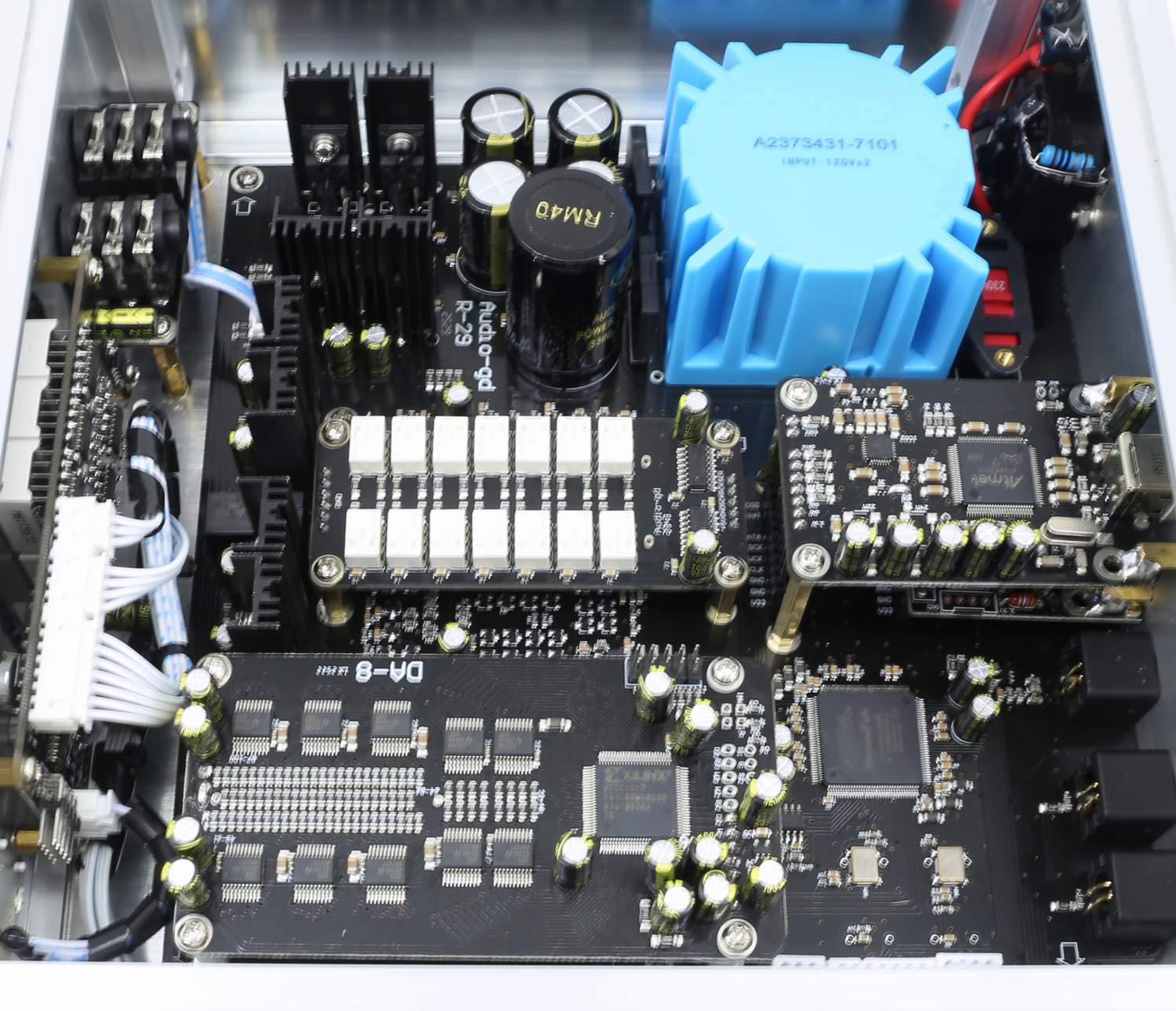 Jednym z kluczowych elementów wysokiej klasy urządzeń audio jest zasilanie. Wszystkie, nawet najtańsze produkty Audio-GD, są wyposażone w wiele dyskretnych, dedykowanych stabilizatorów, zasilających poszczególne moduły składowe urządzeń. W tym celu Audio-GD w swoich produktach stosuje transformatory toroidalne i dyskretne stabilizatory napięcia. Każdy moduł R2R-2 ma dedykowany transformator i sekcje stabilizatorów, osobne dla części cyfrowej i dla każdego kanału części analogowej. Takie rozwiązanie gwarantuje pełną separacje elektryczną modułów. Nie ma niebezpieczeństwa, że prąd zasilania będzie nawet chwilowo niewystarczający, co objawia się w innych urządzeniach słyszalnym ograniczeniem dynamiki, szczególnie w dolnych częstotliwościach pasma odsłuchowego. Zasilacze w R28 NOS są skonstruowane z użyciem dwóch audiofilskich transformatorów toroidalnych.