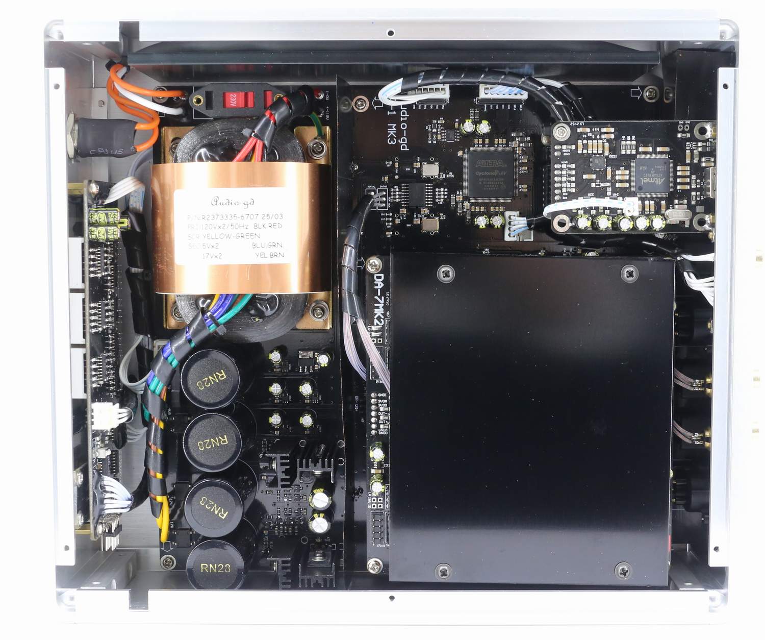 Jednym z kluczowych elementów w wysokiej klasie urządzeń audio jest zasilanie. Audio-GD podchodzi do tego tematu bardzo poważnie. Wszystkie, nawet najtańsze produkty Audio-GD, są wyposażone w wiele dyskretnych stabilizatorów, zasilających indywidualnie moduły składowe urządzeń. Zasilacze impulsowe tak powszechnie stosowane ze względu na swoją wydajność i prostą budowę, nie mogą zapewnić prądu o wysokiej stabilności. Dlatego Audio-GD w swoich produktach stosuje transformatory toroidalne i dyskretne stabilizatory napięcia. Każdy moduł R2R ma dedykowany transformator i sekcje stabilizatorów, osobno dla części cyfrowej i dla każdego kanału części analogowej. Takie rozwiązanie gwarantuje pełną separacje elektryczną modułów. Nie ma niebezpieczeństwa, że prąd zasilania będzie nawet chwilowo niewystarczający, co objawia się w innych urządzeniach słyszalnym ograniczeniem dynamiki, szczególnie w dolnych częstotliwościach pasma odsłuchowego.